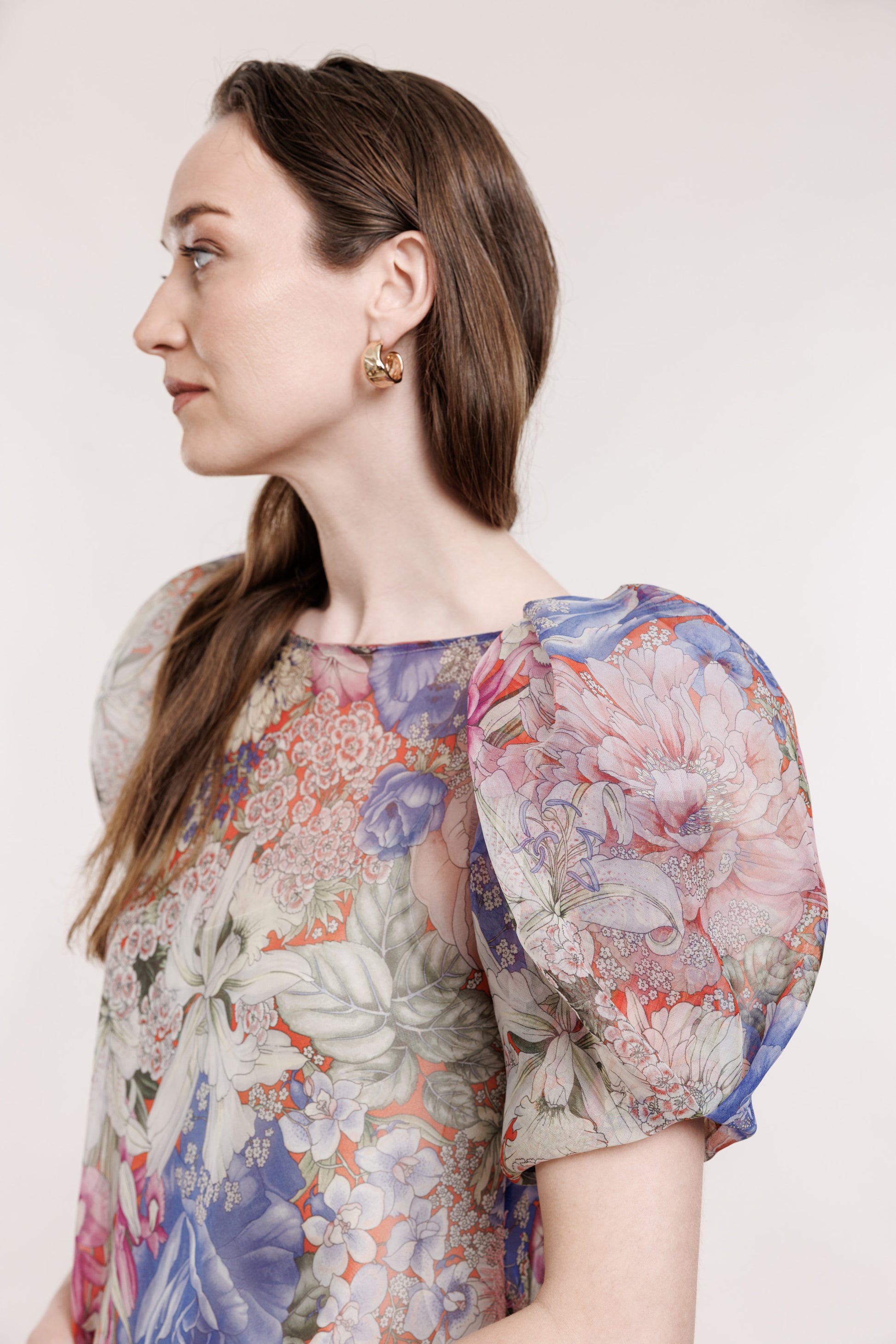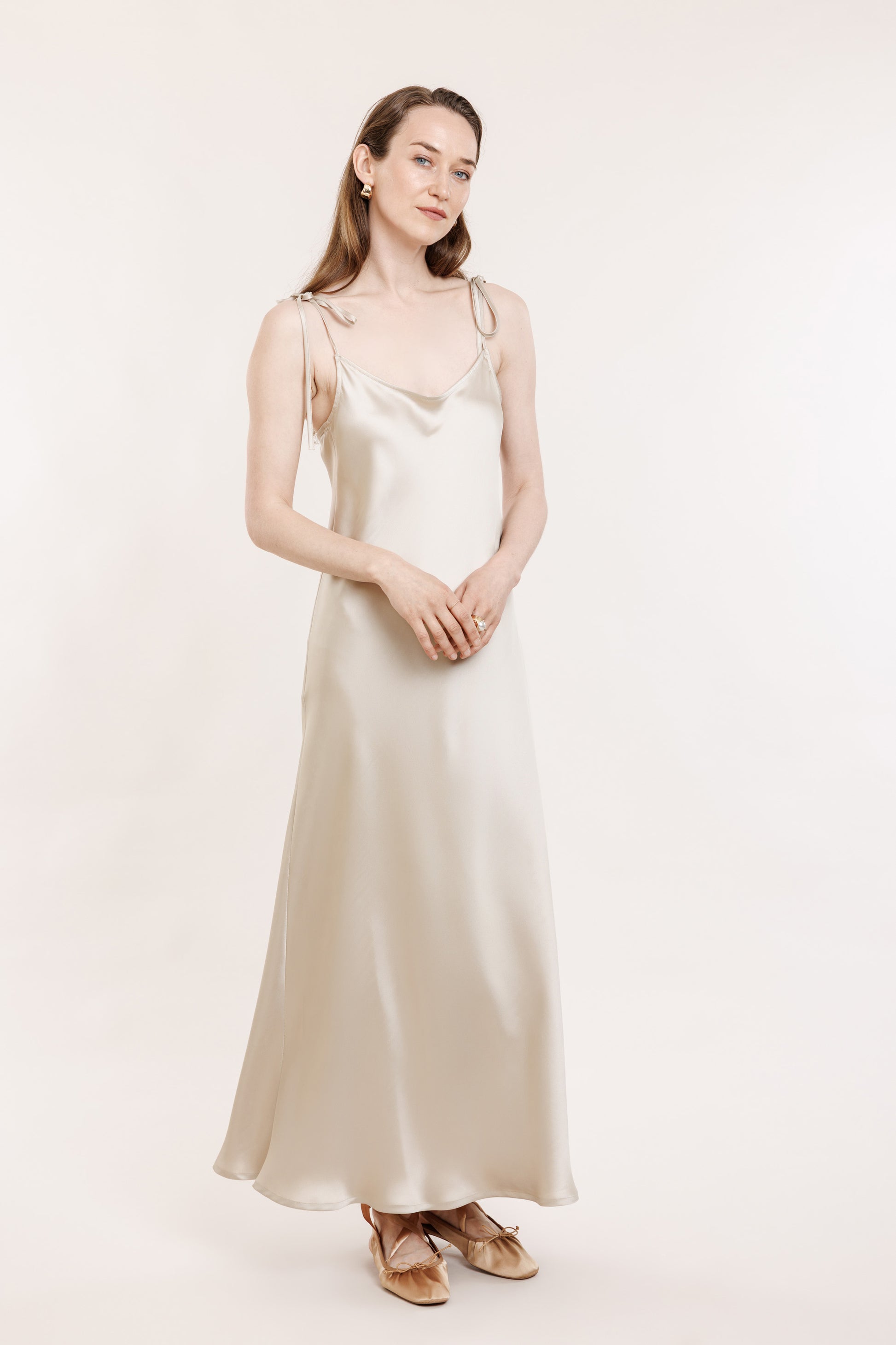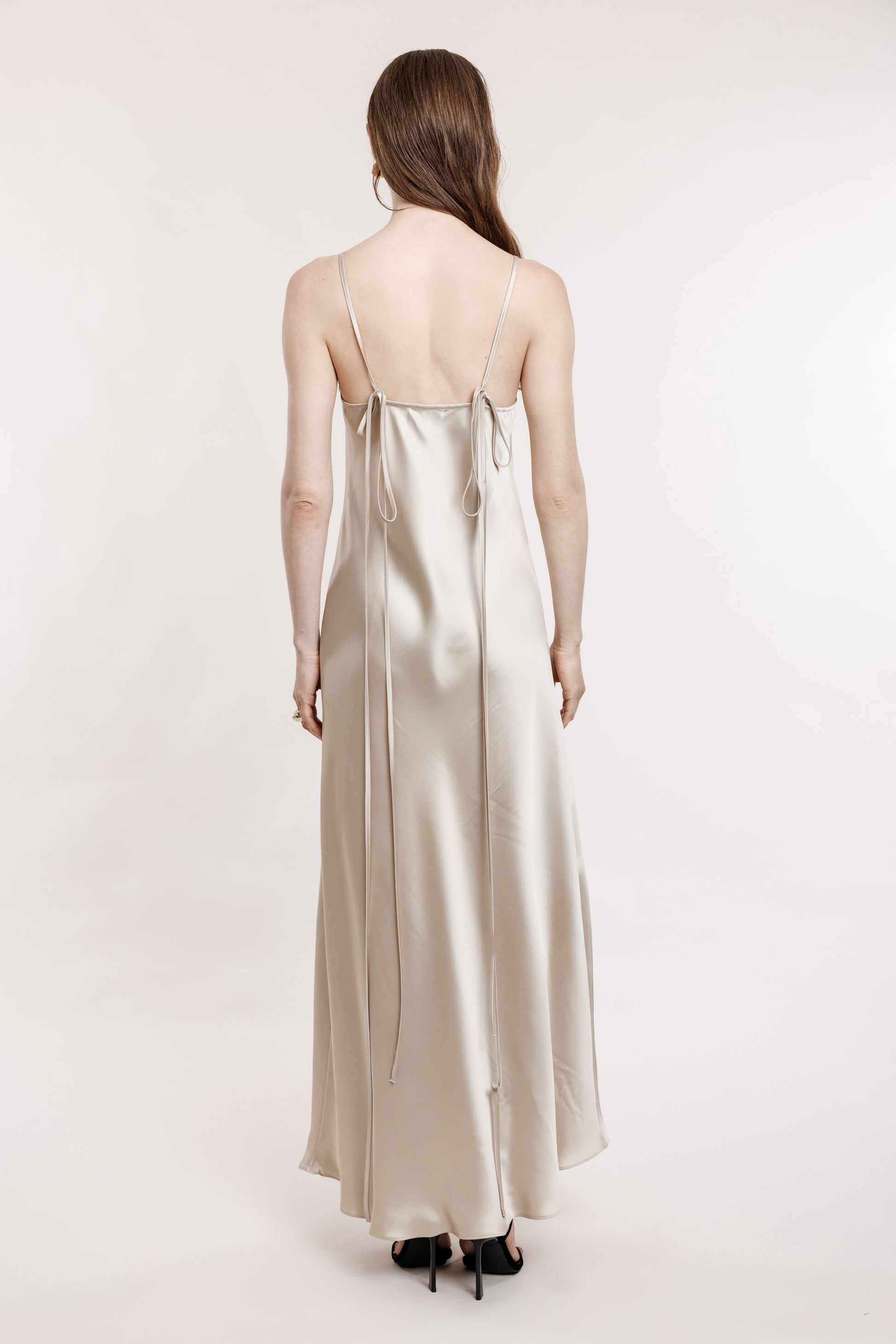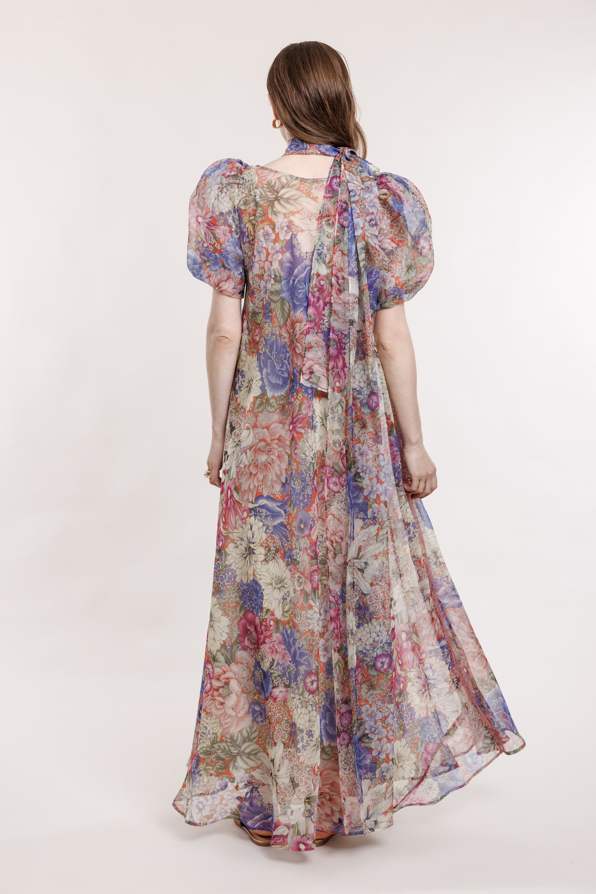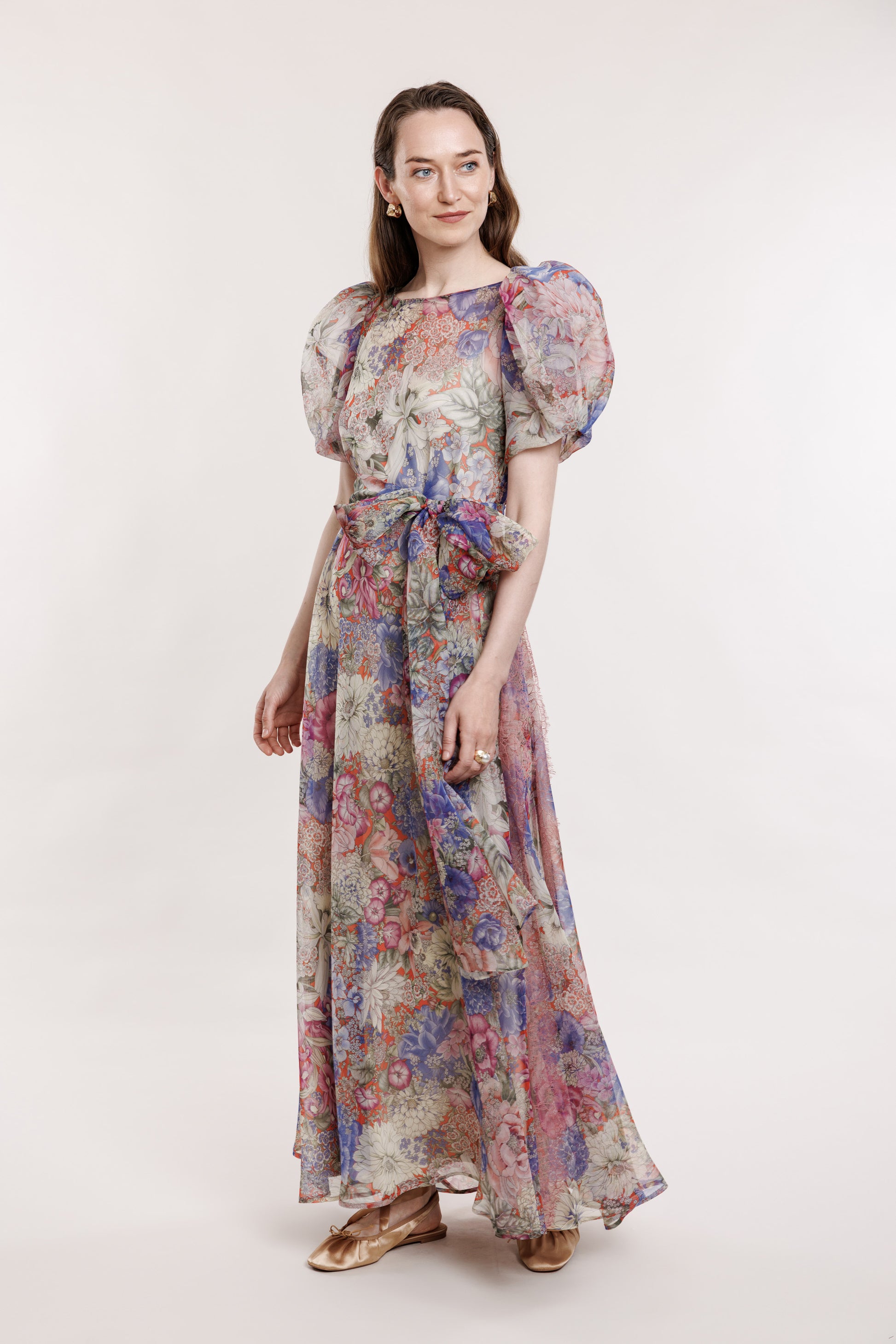 Zīda organzas kleita ar ziedu rakstu un mežģīņu ielaidumiem sānu daļās. Kleitai komplektā apakškleita, jeb slipa kleita ar sasienamām lencītēm. Apakškleita nēsājama kā patstāvīgs izstrādājums ar žaketēm un jakām.